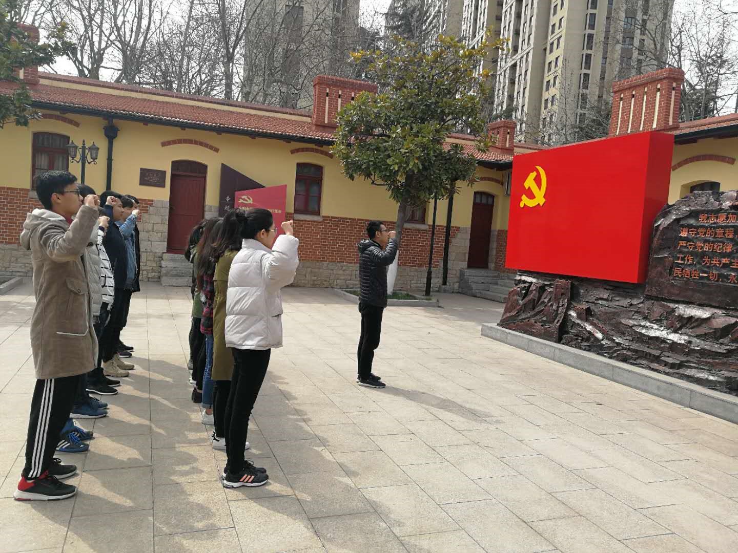 首先,在纪念馆宣誓广场举行党员重温入党誓词宣誓活动,全体在场员工党员面对鲜艳的党旗,由本科生党支部书记王珺鹏领誓,高举右手,庄严宣誓。所有宣誓同学重温了入党誓词及入党的庄严时刻,体会到共产党员的神圣感和光荣感。之后举行佩戴党徽活动。