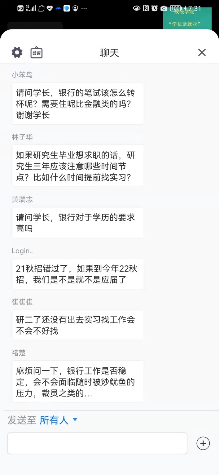 多位同学就自己的就业困惑线上请教,各位员工学长细致耐心的逐一答疑解惑,为同学们理清头绪,拨云见日。多年不见的员工们在消息群里互动致意,同学们则用文字表达了真诚的感谢。张雪蕾对员工们毫无保留的经验分享表示感谢,希望在校同学收获真经,积极行动,苦练内功,早做规划;也祝愿员工们工作顺利,疫情下保护好自己,常回母校看看。