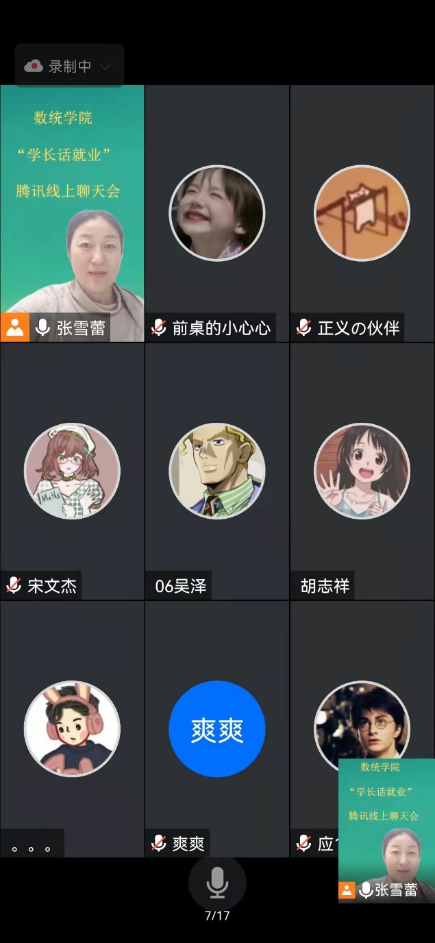随后,在学院员工群里看到通知主动加入聊天会的员工董彬、赵振伟、项帅也分别与同学们做了交流。董彬对自己所在的软件公司做了介绍,并给参会的学弟学妹现场提供了多个实习和招聘的岗位。现在内蒙古从事基层工作的赵振伟分享了“三支一扶”的工作日常和心得体会。项帅讲解了证券行业的从业心得,并留下电话邀请同学们前去参观实习。