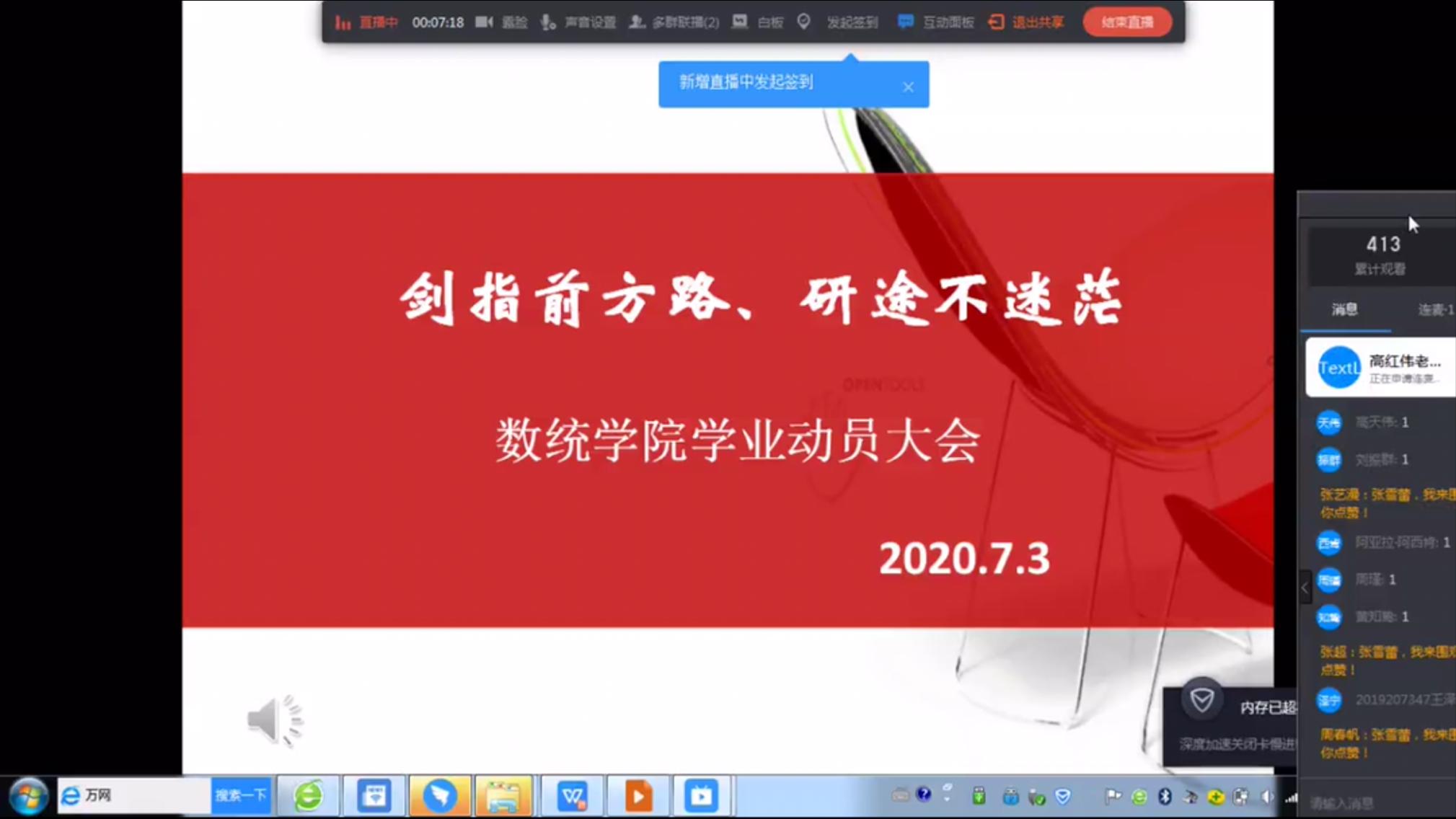 7月3日上午,为鼓励更多同学参与到考研中来,bevictor伟德通过钉钉线上直播的方式召开主题为“剑指前方路-研途不迷茫”学业动员大会。参会人员有公司党委书记姜永杰、经理高红伟、党委副书记张雪蕾、副经理丁洁玉、系主任杜守强、刘开恩、张齐、王磊,全体教科办老师以及辅导员老师,三位毕业生代表孙小雅、朱庆华、张正源也应邀参加会议。会议由张雪蕾主持,三个年级全体本科生线上参与。